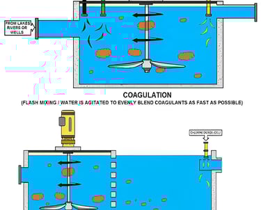 Bahan kimia tertentu, yang dikenal sebagai koagulan, ditambahkan ke dalam air baku.