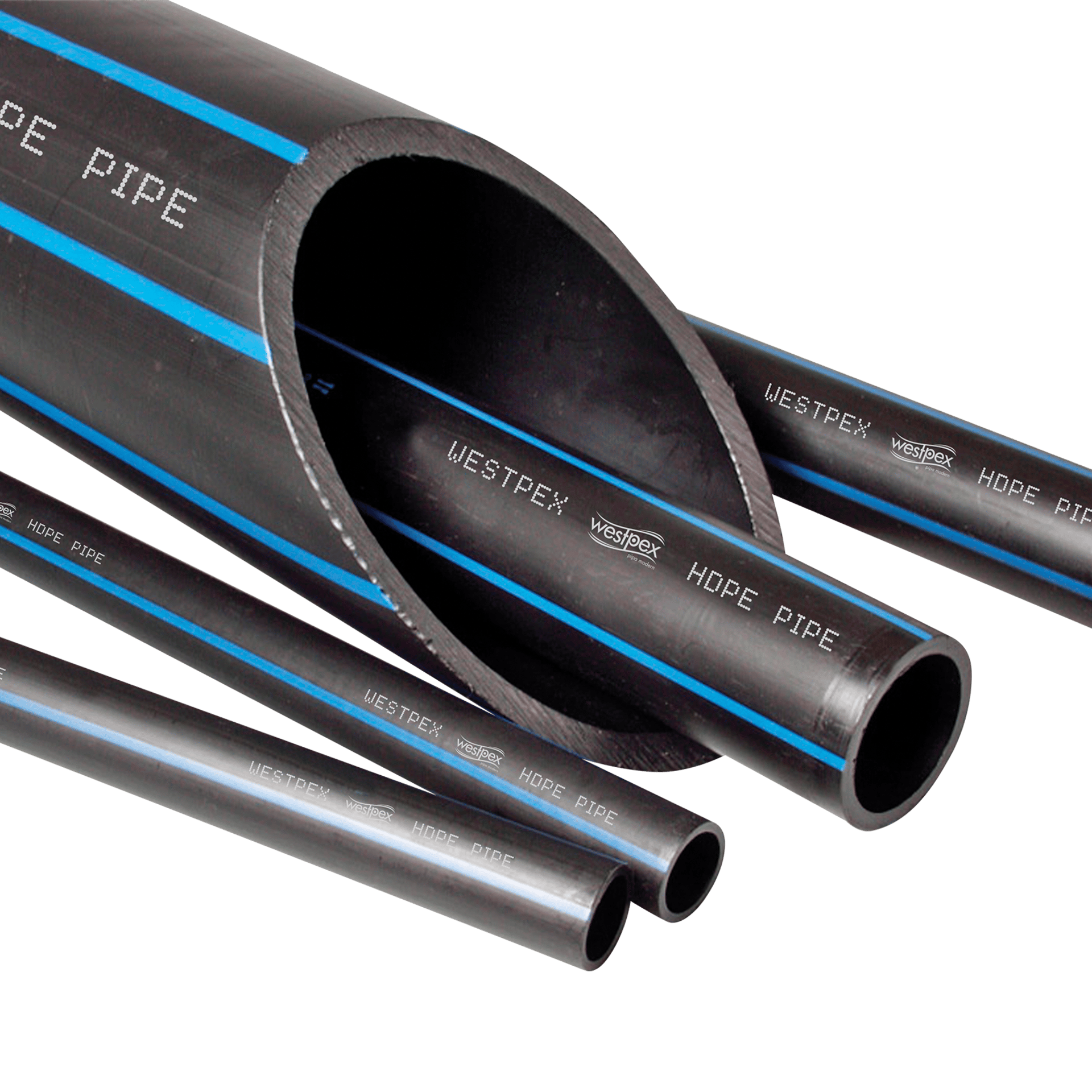 Pipa HDPE (High-Density Polyethylene) yang dikenal karena fleksibilitas, kekuatan, dan ketahanannya terhadap korosi dan bahan kimia. Pipa ini digunakan secara luas untuk aplikasi seperti distribusi air bersih, saluran pembuangan, irigasi, dan perpipaan gas karena daya tahan dan umur pakainya yang panjang.
